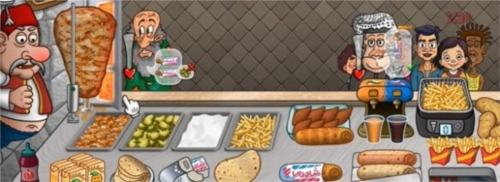 游戲的左側為我們的“員工”,我們可以點擊他幫忙上貨,四個格子里分別是烤肉、黃瓜、沙拉醬和薯條,桌臺上還有卷餅和包裝,右側為炸薯條機和橙汁/可樂機。除此之外,當我們做錯物品,還可以將其當“垃圾桶”來消化。