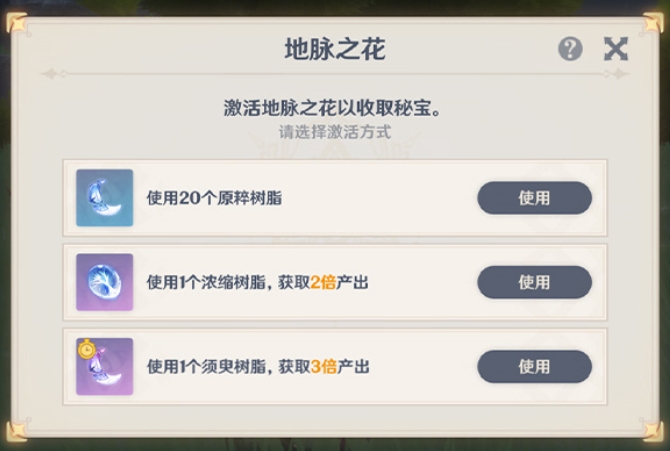 4、刷20體的地脈/秘境可以選擇消耗須臾樹脂,一次性獲得3倍獎勵(以后重復刷本就不用捏完樹脂回去合成濃縮后再回來刷了)