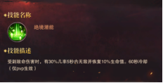 其中 ?絕境潛能-受到致命傷害時(shí),有30%幾率5秒內(nèi)無敵并回復(fù)10%的生命值。60秒冷卻時(shí)間(僅pvp生效)