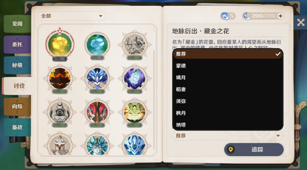 5、討伐新增地脈花,選擇地區(qū)后可一鍵追蹤,同時新增查看目標首領特性/抗性/弱點的功能