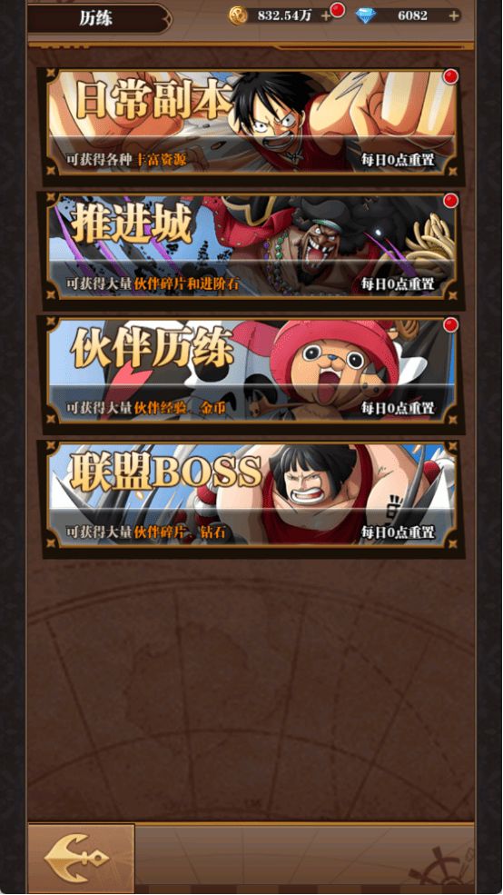 本游戲有非常多有意思的副本玩法,在推進(jìn)城中首通層數(shù)可獲得大量伙伴碎片和進(jìn)階石,掃蕩可獲得大量貝里和突破卡?;锇闅v練中可以可獲得大量伙伴經(jīng)驗(yàn)、金幣。強(qiáng)者降臨:挑戰(zhàn)boss可以獲得鉆石、進(jìn)階石和貝利。更有多種玩法,獲取豐富資源。還有更多副本玩法等你來(lái)發(fā)現(xiàn)!