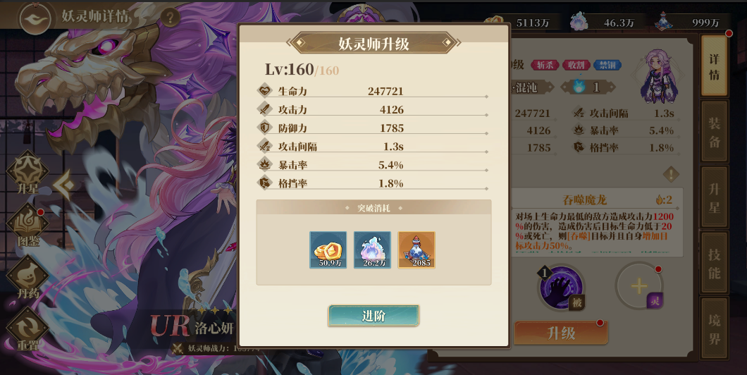 妖靈師可以通過消耗升級材料(妖晶幣、龍?jiān)`液)提升等級,而升級可以提升面板屬性,當(dāng)達(dá)到等級上限時(shí)可以通過消耗妖晶幣、龍?jiān)`液和九轉(zhuǎn)丹進(jìn)階等級上限。不過前期資源有限,還是盡量避免將養(yǎng)成材料分散給太多角色,練好一隊(duì)主力隊(duì)伍能過主線才是最重要的。?