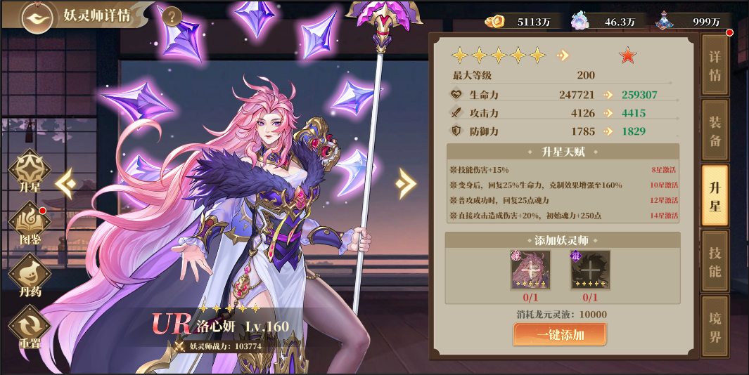升星可以提高英雄的各項(xiàng)初始屬性,每次升星需要消耗不同條件升星材料,升星達(dá)到指定星級后還可額外解鎖該妖靈師獨(dú)有的升星天賦。已經(jīng)滿星或溢出的妖靈師可通過招募——遣散功能進(jìn)行遣散,再用獲得的時(shí)空殘卷到秘寶軒的兌換商店中兌換自己所需要的妖靈師。